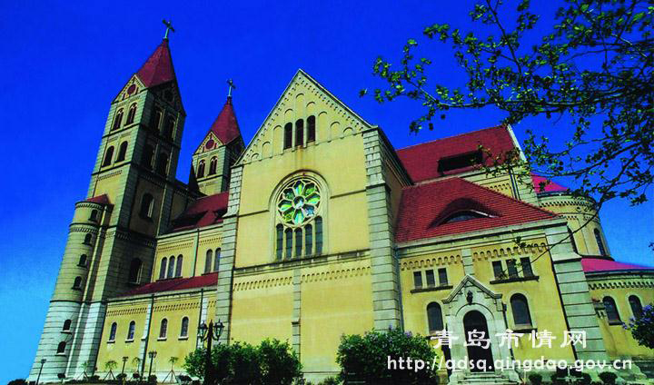 也稱圣彌愛爾大教堂。位于青島市市南區(qū)浙江路15號,是青島地區(qū)最大的天主教堂和哥特式建筑,也是中國唯一的祝圣教堂,建于1932~1934年,占地面積11480平方米,建筑面積1877平方米。建筑平面呈十字形,教堂主體兩翼,各聳一座尖塔,塔高56米,頂端各立有一個4.5米高的巨型十字架。大廳高18米,可納千人,內(nèi)部采用意大利文藝復(fù)興時期的裝飾,穹頂繪以圣像壁畫。1992年,被列為省級文物保護單位。2006年,作為青島德國建筑群之一,被列為全國重點文物保護單位。