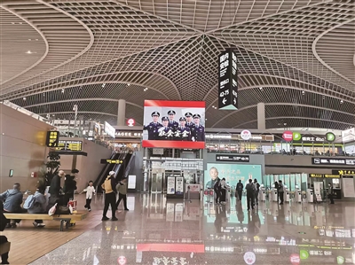青島膠東國際機(jī)場候機(jī)樓播放第十個(gè)全民國家安全教育日海報(bào)和公益視頻。