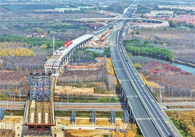 11月13日,沈海高速改擴(kuò)建上跨膠濟(jì)、膠新鐵路立交橋鋼箱梁圓滿完成轉(zhuǎn)體施工。