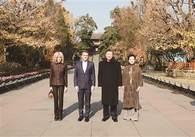 12月5日,國家主席習(xí)近平在四川省成都市都江堰同法國總統(tǒng)馬克龍進(jìn)行友好交流。這是習(xí)近平和夫人彭麗媛同馬克龍夫婦合影?! ?新華社照片
