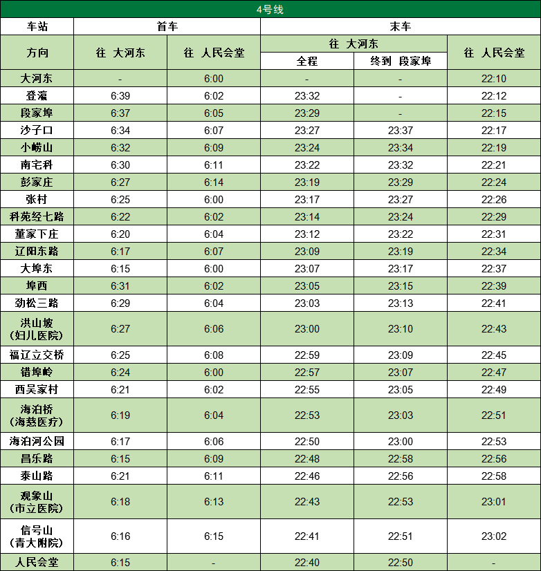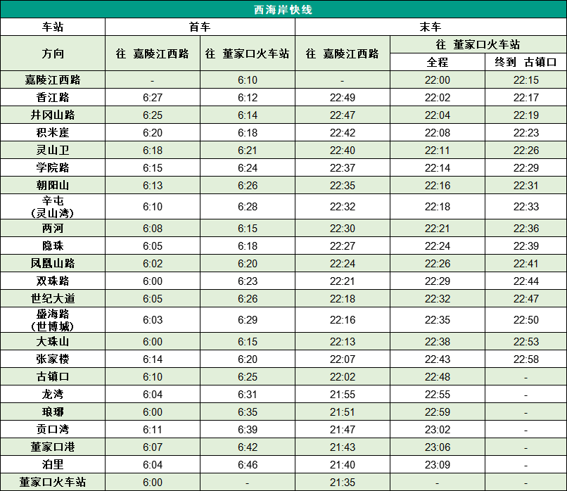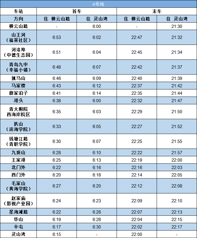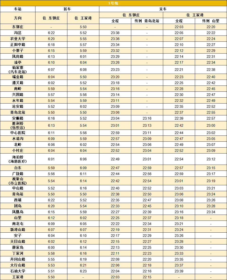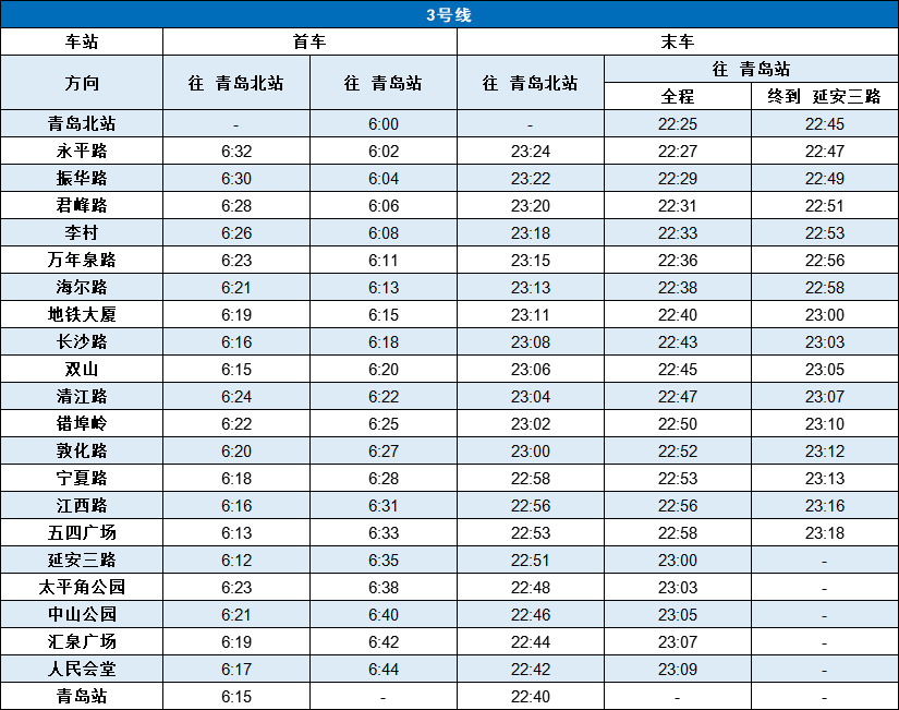 青島地鐵1號線運(yùn)營時間17.85小時、2號線運(yùn)營時間17.57小時、3號線運(yùn)營時間17.43小時、4號線運(yùn)營時間17.63小時、6號線運(yùn)營時間16.83小時,8號線運(yùn)營時間17.45小時,藍(lán)谷快線運(yùn)營時間17.20小時、西海岸快線運(yùn)營時間17.23小時(各線路首末班車時刻見下圖)。