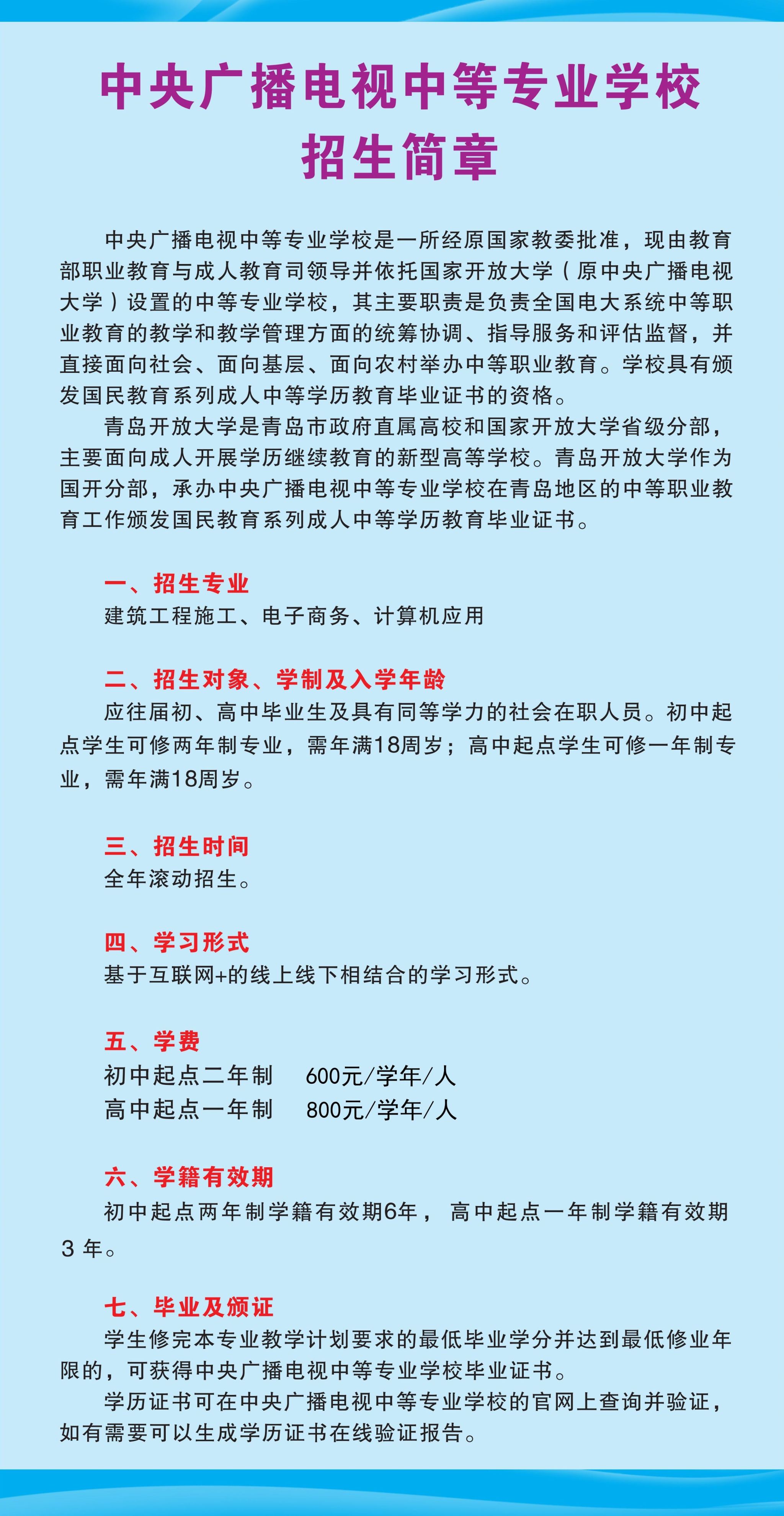 青島開(kāi)放大學(xué)與中央廣播電視中等專業(yè)學(xué)校合作辦學(xué)收費(fèi)標(biāo)準(zhǔn)公示