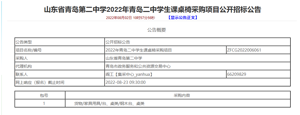 青島二中2022年學(xué)生課桌椅采購(gòu)項(xiàng)目公開招標(biāo)公告