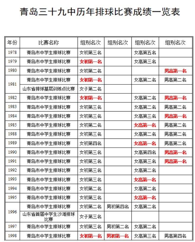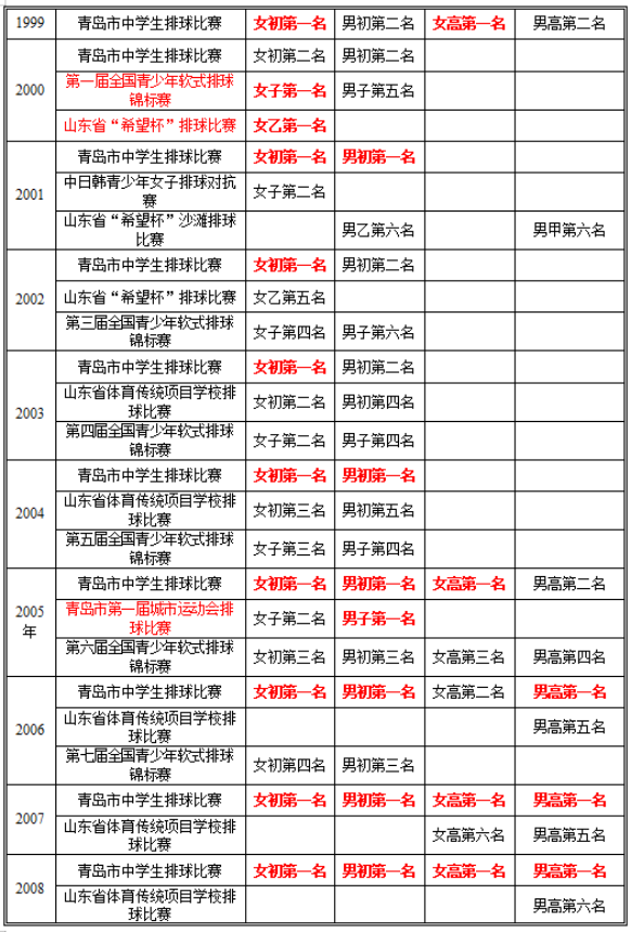 我校學(xué)生所取得的的體育運(yùn)動(dòng)成績,主要以學(xué)校排球隊(duì)為主。我校排球隊(duì)所取得的優(yōu)秀成績有:全國軟排錦標(biāo)賽女排第一名、山東省希望杯排球錦標(biāo)賽女排第一名、作為中國二隊(duì)參加中日韓三國對抗賽獲得第二名。我校高中自2005年至2021年所參加的17次青島市市級排球比賽中,高中女排取得過14次冠軍,創(chuàng)造了11連冠的記錄,高中男排取得過14次冠軍,創(chuàng)造了8連冠的記錄。