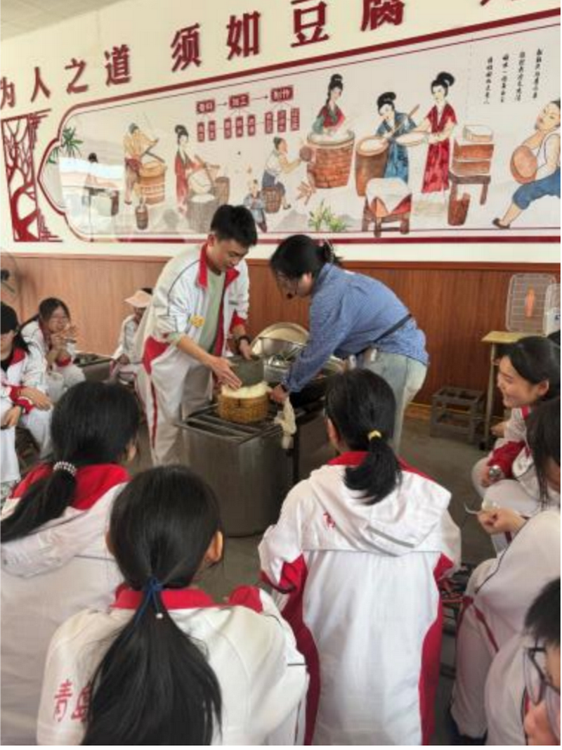 午后,各班正式開啟了豐富多彩的學(xué)農(nóng)實踐活動。在做豆腐體驗區(qū),同學(xué)們緊緊圍繞在制作設(shè)備旁,目不轉(zhuǎn)睛地聆聽工作人員講解每一道工序。隨后,大家親自動手,轉(zhuǎn)動石磨磨出細(xì)膩的豆?jié){,再小心翼翼地點鹵??粗?jié){神奇地變成鮮嫩的豆腐,每個人臉上都洋溢著驚喜與自豪。?