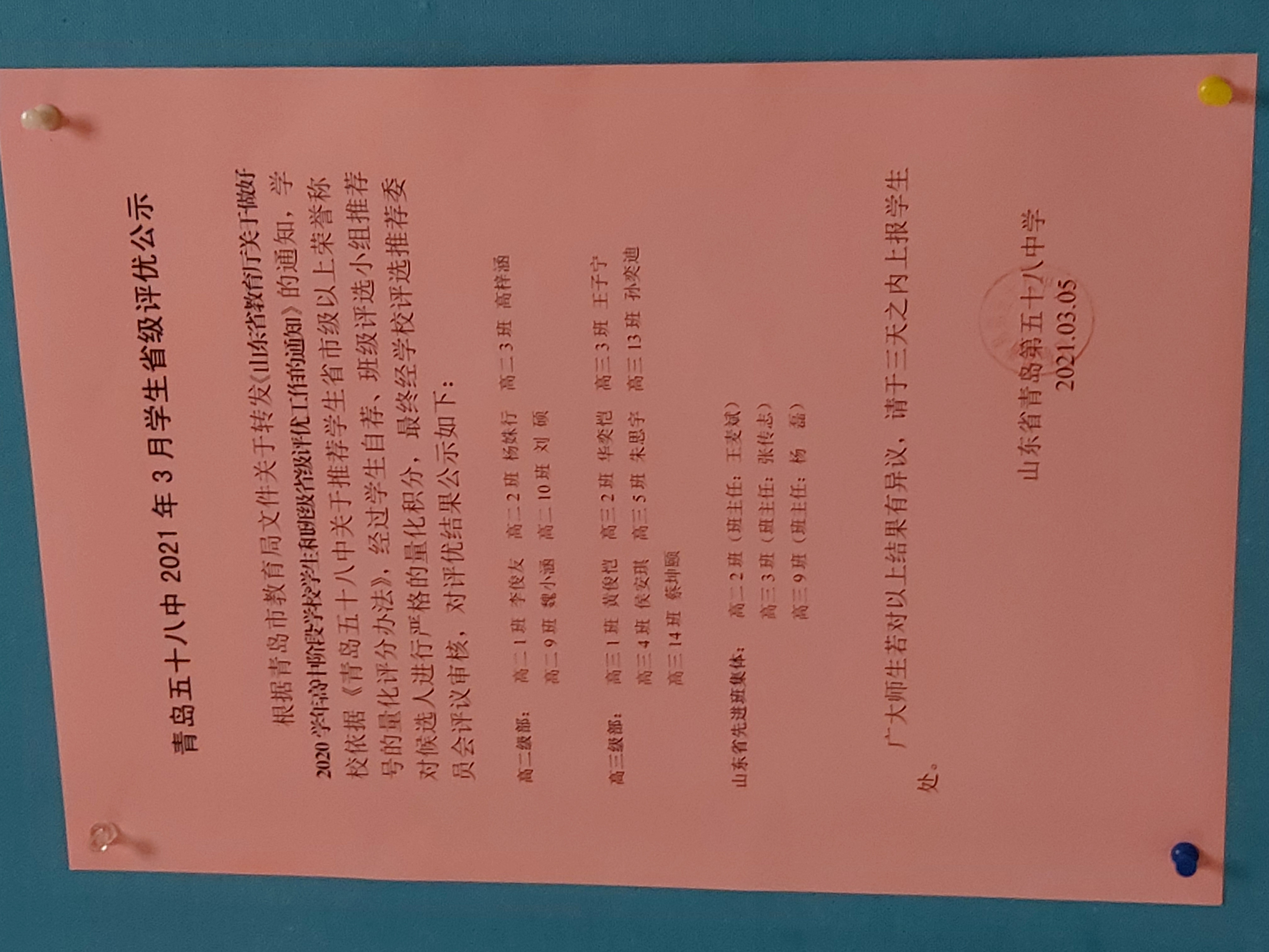 青島五十八中2021年3月省級評優(yōu)情況公示