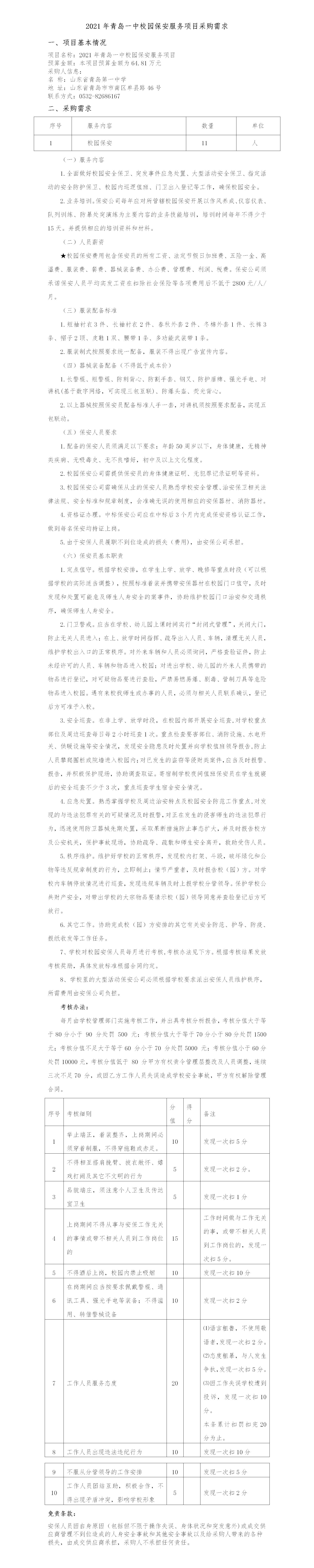 青島一中2021年校園保安服務(wù)項目需求公示