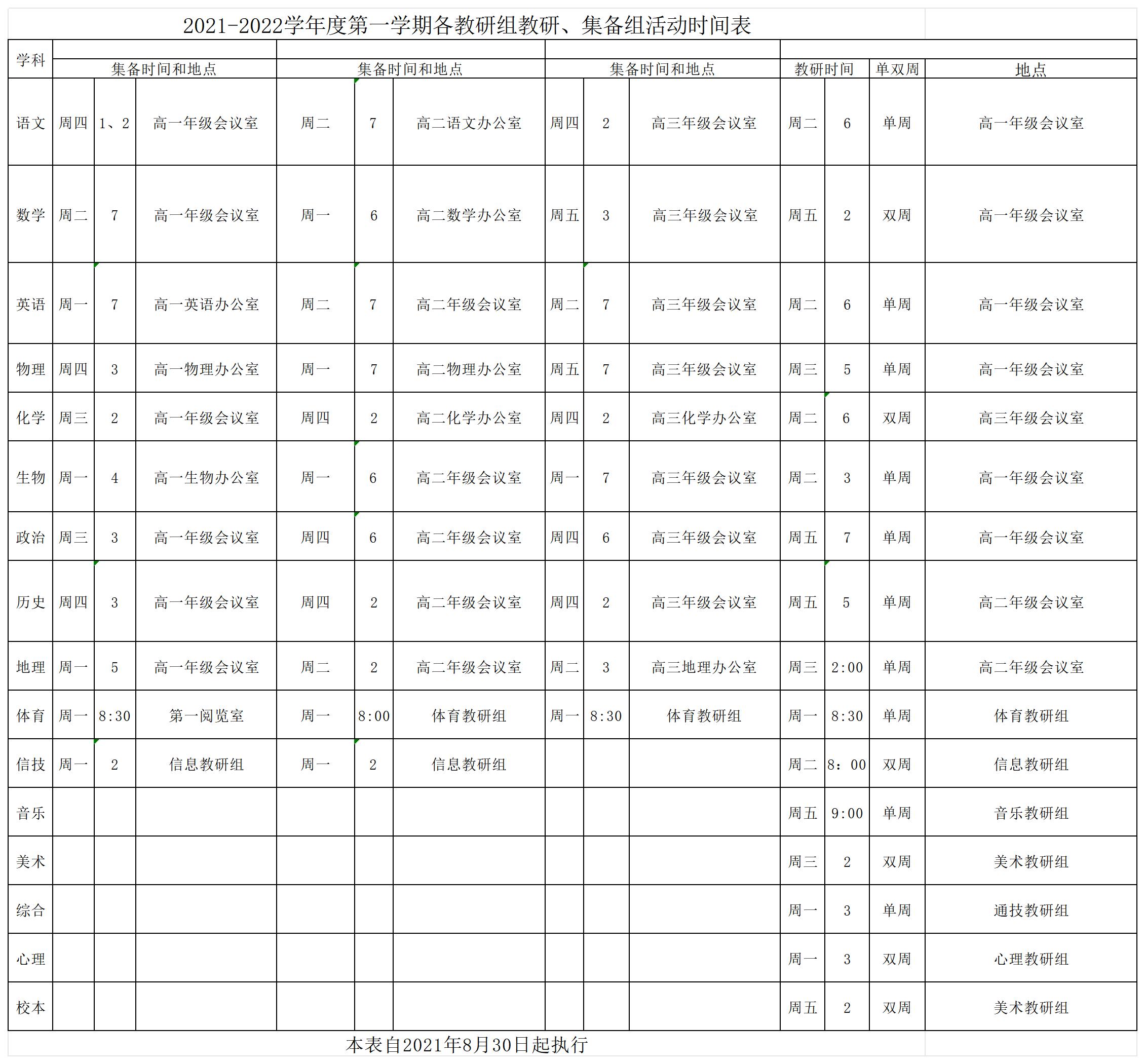 青島一中2021-2022學(xué)年度第一學(xué)期教研、集備時(shí)間