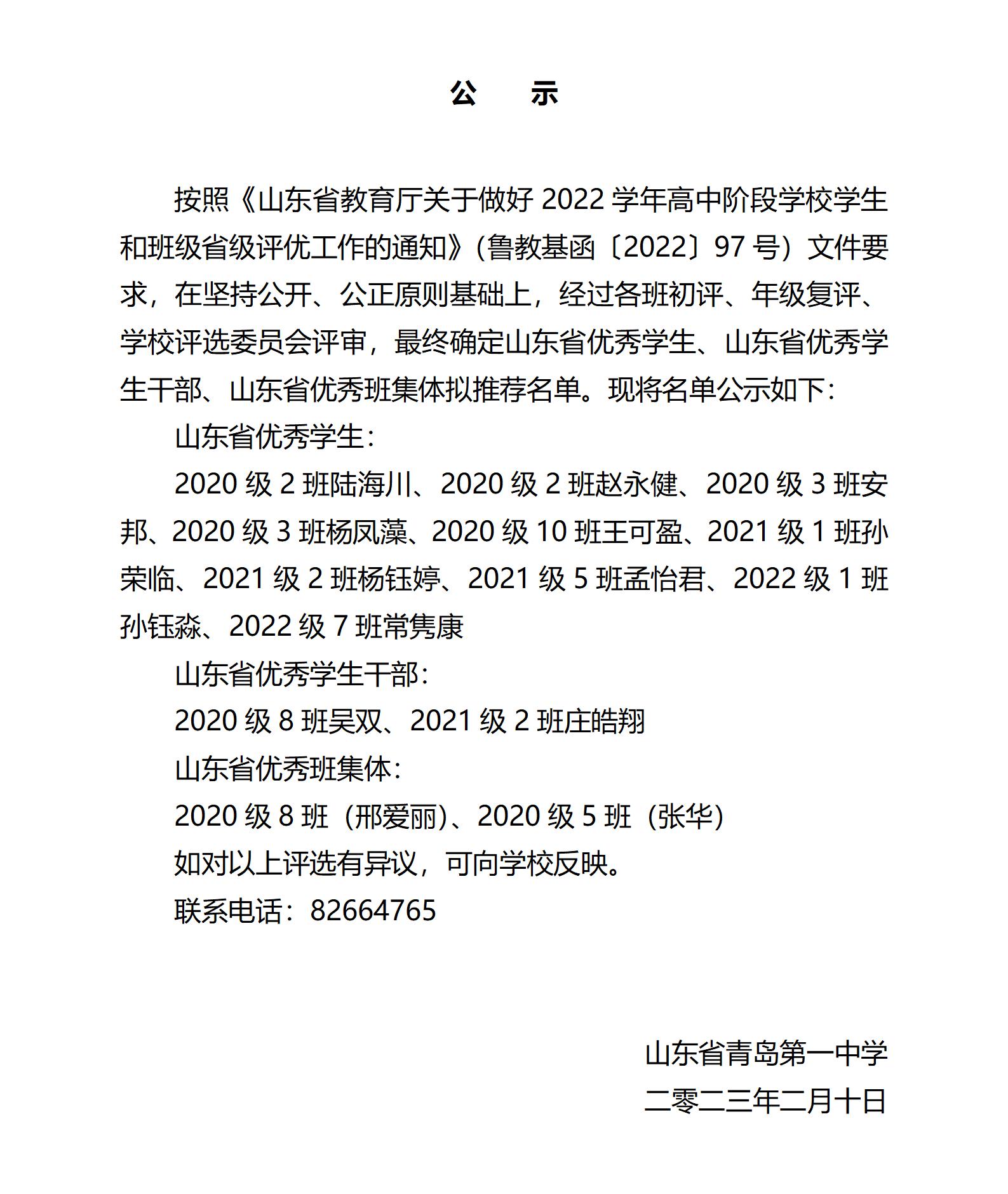 青島一中2022-2023學(xué)年度省優(yōu)學(xué)生名單公示