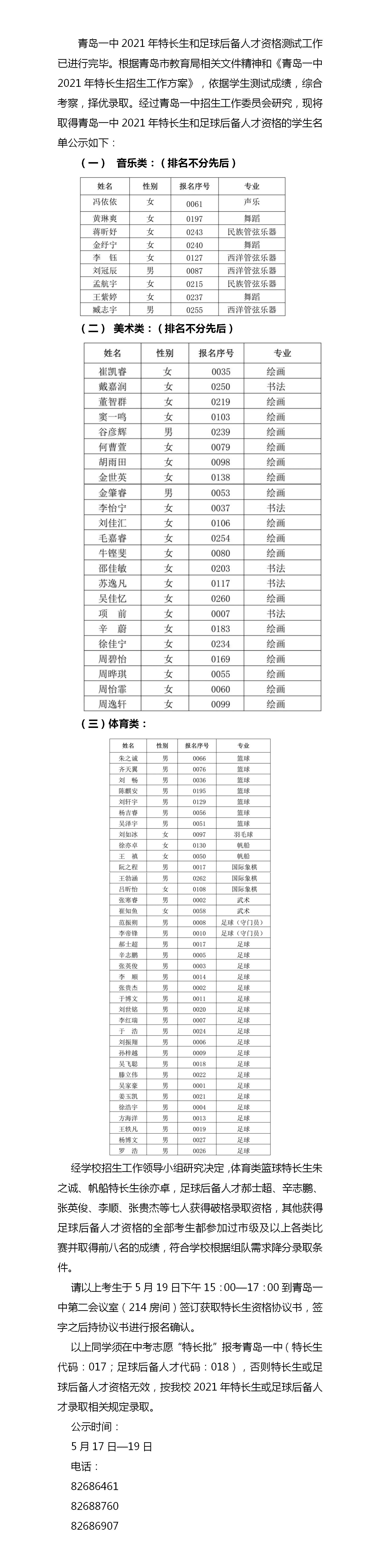 取得青島一中2021年特長生資格學(xué)生名單公示