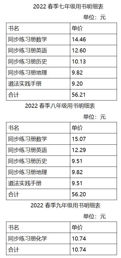 根據(jù)青財(cái)教【2020】21號(hào)《關(guān)于免除城市義務(wù)教育段學(xué)生教科書(shū)費(fèi)和全市義務(wù)教育段學(xué)生作業(yè)本費(fèi)的通知》 文件規(guī)定,免費(fèi)包括:國(guó)家課程用書(shū)、地方課程用書(shū)、寒假作業(yè)、作業(yè)本。之前根據(jù)《青島市中小學(xué)教輔材料選用目錄》選用的學(xué)習(xí)用書(shū)需收費(fèi)?,F(xiàn)2022春季收費(fèi)用書(shū)明細(xì)已結(jié)算完畢,請(qǐng)核對(duì)。