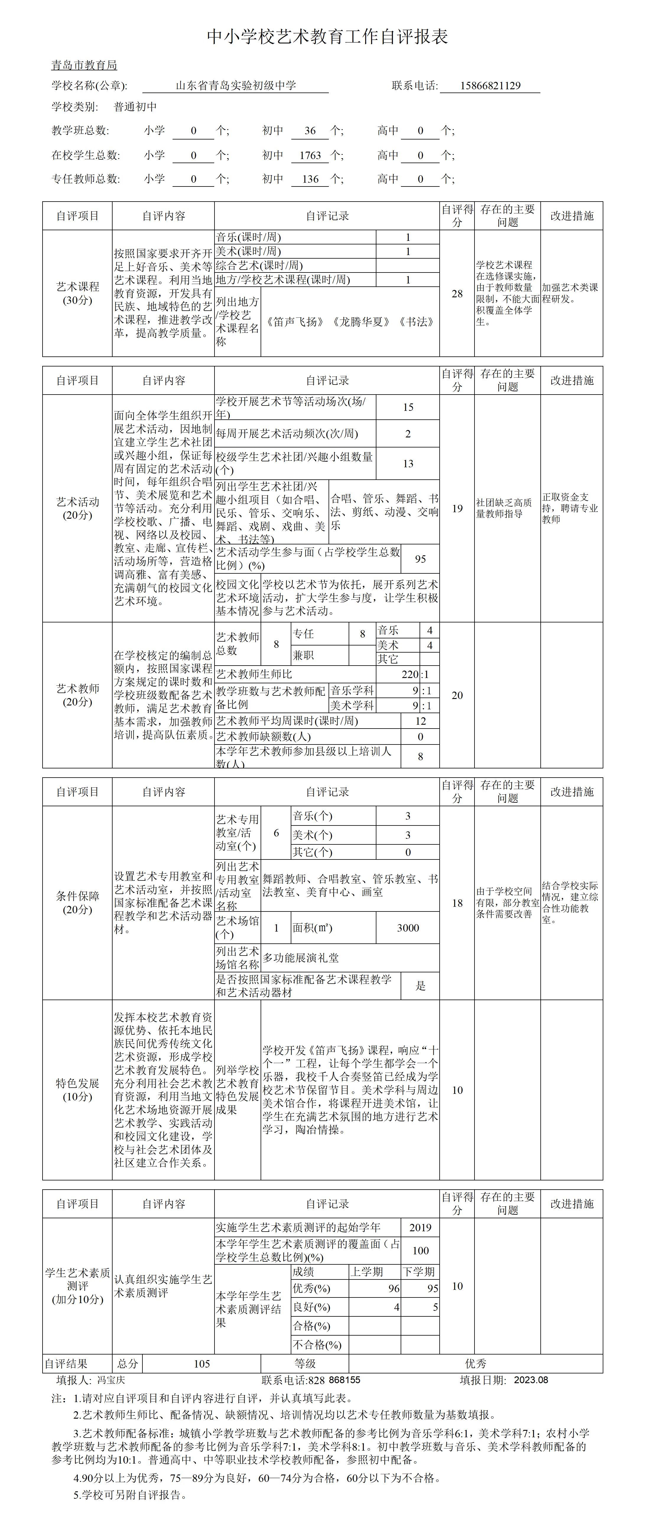 青島實(shí)驗(yàn)初中2023年中小學(xué)校藝術(shù)教育工作自評報(bào)表
