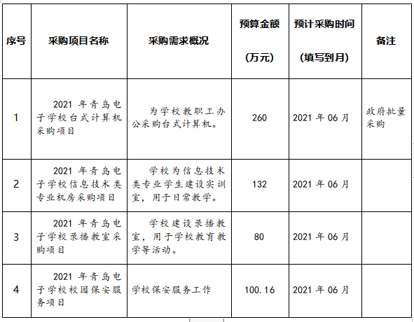 為便于供應商及時了解政府采購信息,根據(jù)《財政部關于開展政府采購意向公開工作的通知》(財庫〔2020〕10號)等有關規(guī)定,現(xiàn)將 青島電子學校 2021年 05(至)06 月采購意向公開如下: