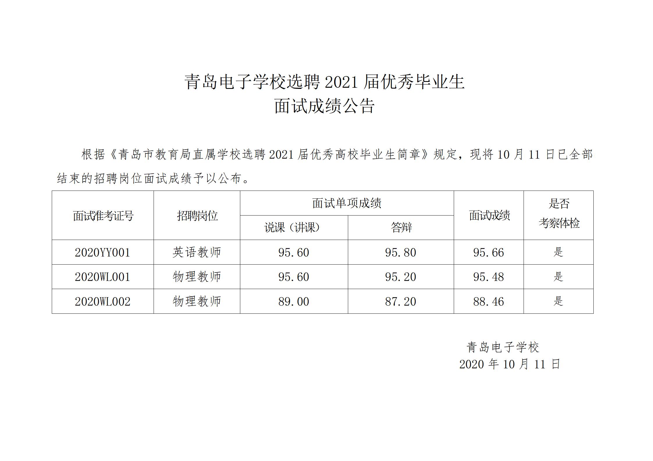 青島電子學(xué)校 選聘2021屆優(yōu)秀畢業(yè)生面試成績公告