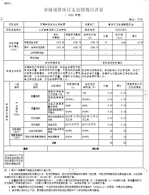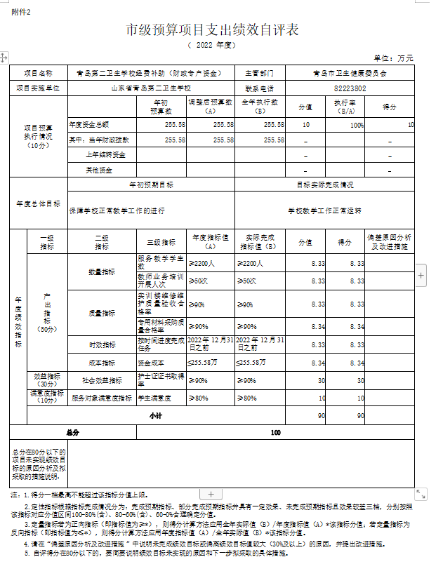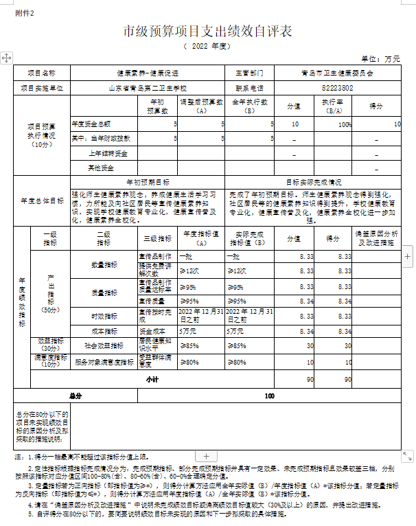 今年在單位決算中反映了2022年度全部市級預算項目績效自評 情況,以及“健康素養(yǎng)-健康促進”“青島第二衛(wèi)生學校經費補助 (財政專戶資金)”“市屬學校生均公用經費”等3個項目的績效自評表。