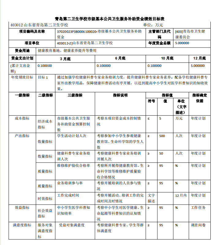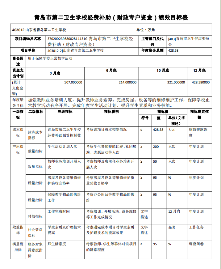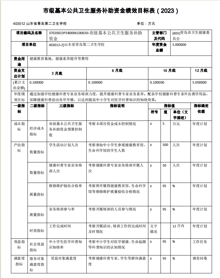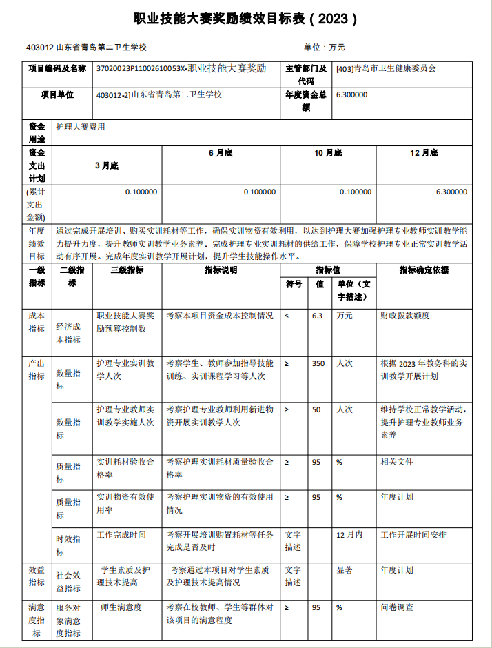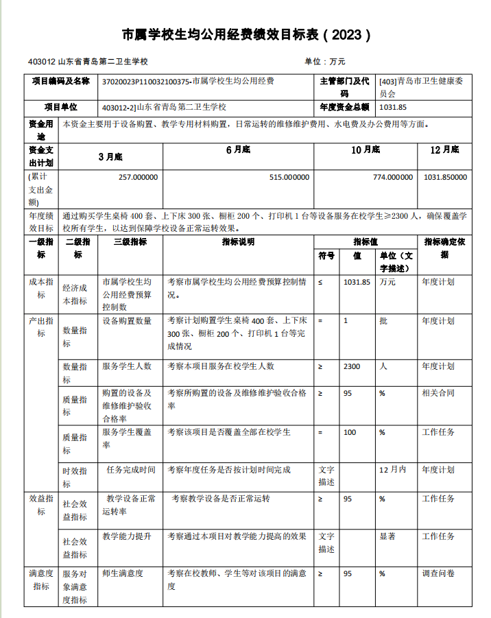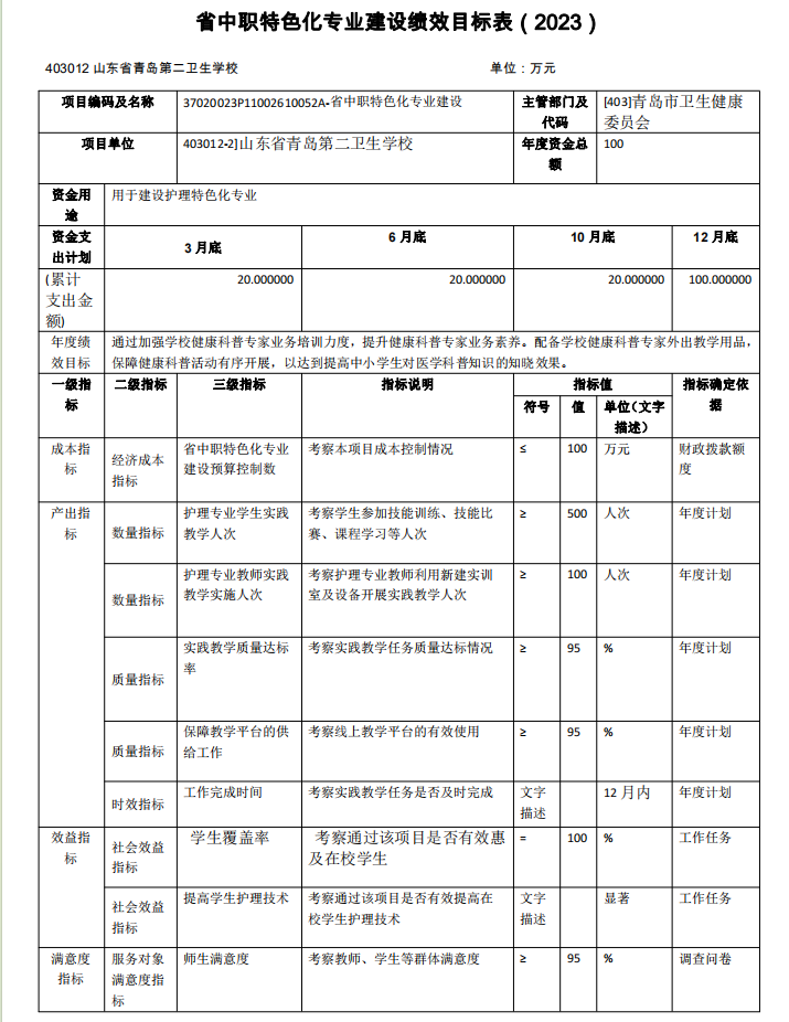 山東省青島第二衛(wèi)生學(xué)校2023年項目支出全面實施績效目標(biāo) 管理,涉及預(yù)算項目支出5個,預(yù)算資金1571.73萬元,其中財政 撥款1143.15萬元。擬對本公共衛(wèi)生服務(wù)補助資金等1個項目開展 單位重點績效評價,涉及預(yù)算資金5.00 萬元,其中財政撥款5.00 萬元。根據(jù)以前年度績效評價結(jié)果,優(yōu)化基本公共衛(wèi)生服務(wù)補助 資金、市屬學(xué)校生均公用經(jīng)費等項目支出2023年預(yù)算安排,進一步改進管理、完善政策。