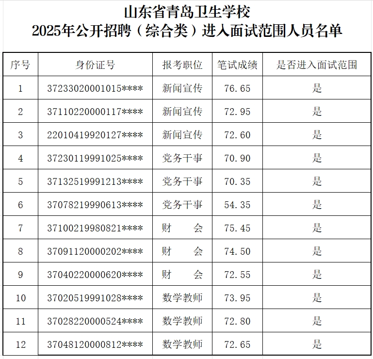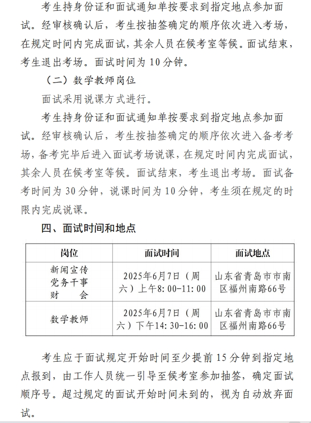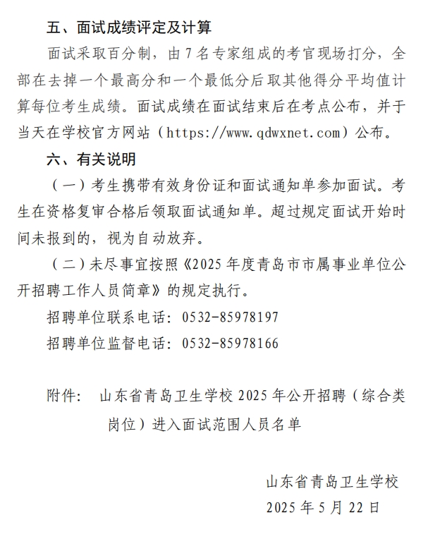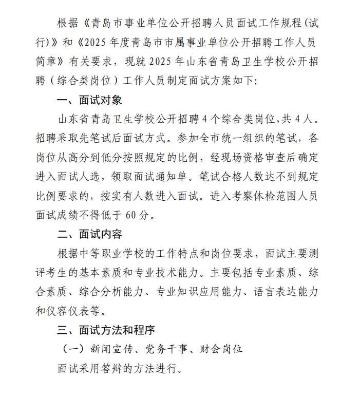 山東省青島衛(wèi)生學(xué)校2025年公開招聘(綜合類崗位)工作人員面試方案