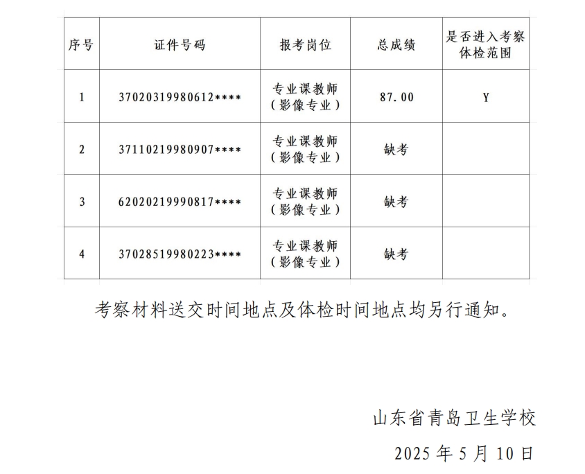 山東省青島衛(wèi)生學(xué)校2025年校園招聘考生總成績(jī)及進(jìn)入考察體檢范圍人員名單