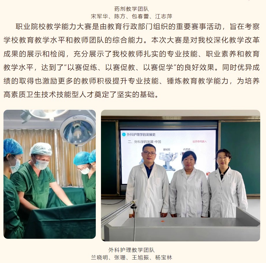 職業(yè)院校教學(xué)能力大賽是由教育行政部門組織的重要賽事活動(dòng),旨在考察學(xué)校教育教學(xué)水平和教師團(tuán)隊(duì)的綜合能力。本次大賽是對(duì)我校深化教學(xué)改革成果的展示和檢閱,充分展示了我校教師扎實(shí)的專業(yè)技能、職業(yè)素養(yǎng)和教育教學(xué)水平,達(dá)到了“以賽促練、以賽促教、以賽促學(xué)”的良好效果。同時(shí)優(yōu)異成績(jī)的取得也激勵(lì)更多的教師積極提升專業(yè)技能、錘煉教育教學(xué)能力,為培養(yǎng)高素質(zhì)衛(wèi)生技術(shù)技能型人才奠定了堅(jiān)實(shí)的基礎(chǔ)。