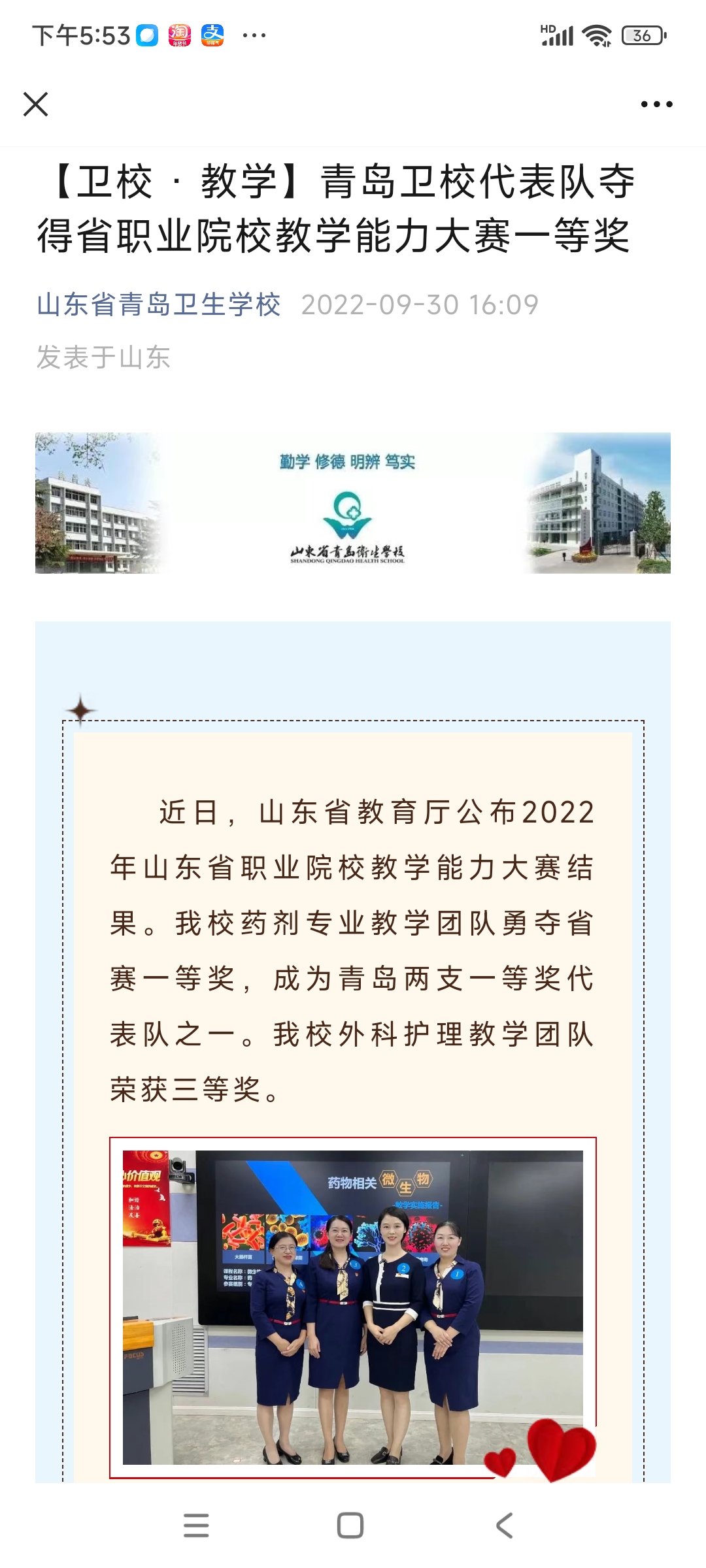 近日,山東省教育廳公布2022年山東省職業(yè)院校教學(xué)能力大賽結(jié)果。我校藥劑專業(yè)教學(xué)團(tuán)隊(duì)勇奪省賽一等獎(jiǎng),成為青島兩支一等獎(jiǎng)代表隊(duì)之一。我校外科護(hù)理教學(xué)團(tuán)隊(duì)榮獲三等獎(jiǎng)。