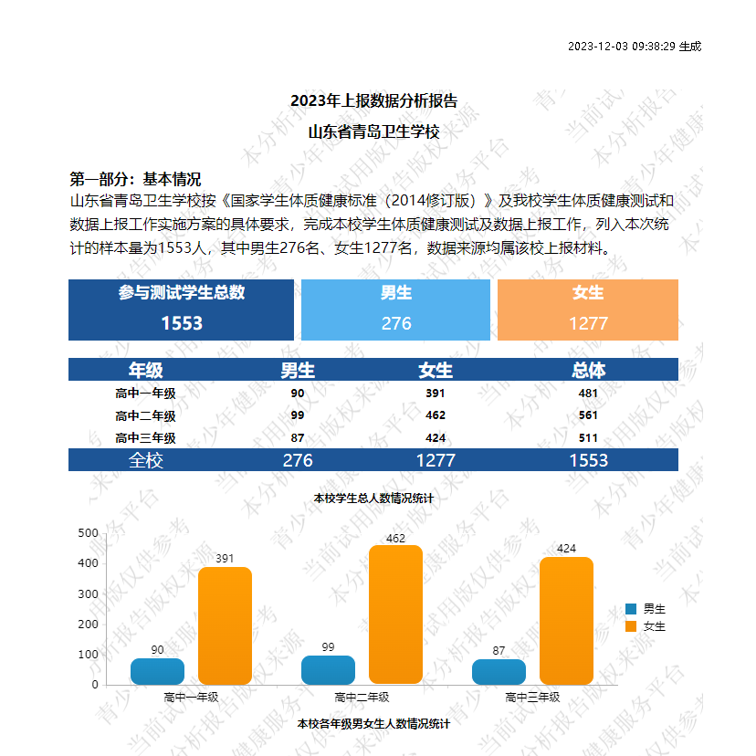 山東省青鳥衛(wèi)生學(xué)校按《國家學(xué)生體質(zhì)健康標(biāo)準(zhǔn)(2014修訂版)》及我校學(xué)生體質(zhì)健康測(cè)試和數(shù)據(jù)上報(bào)工作實(shí)施方案的具體要求,完成本校學(xué)生體質(zhì)健康測(cè)試及數(shù)據(jù)上報(bào)工作,列入本次統(tǒng)計(jì)的樣本量為1553人,其中男生276名、女生1277名,數(shù)據(jù)來源均厲該校上報(bào)材料。