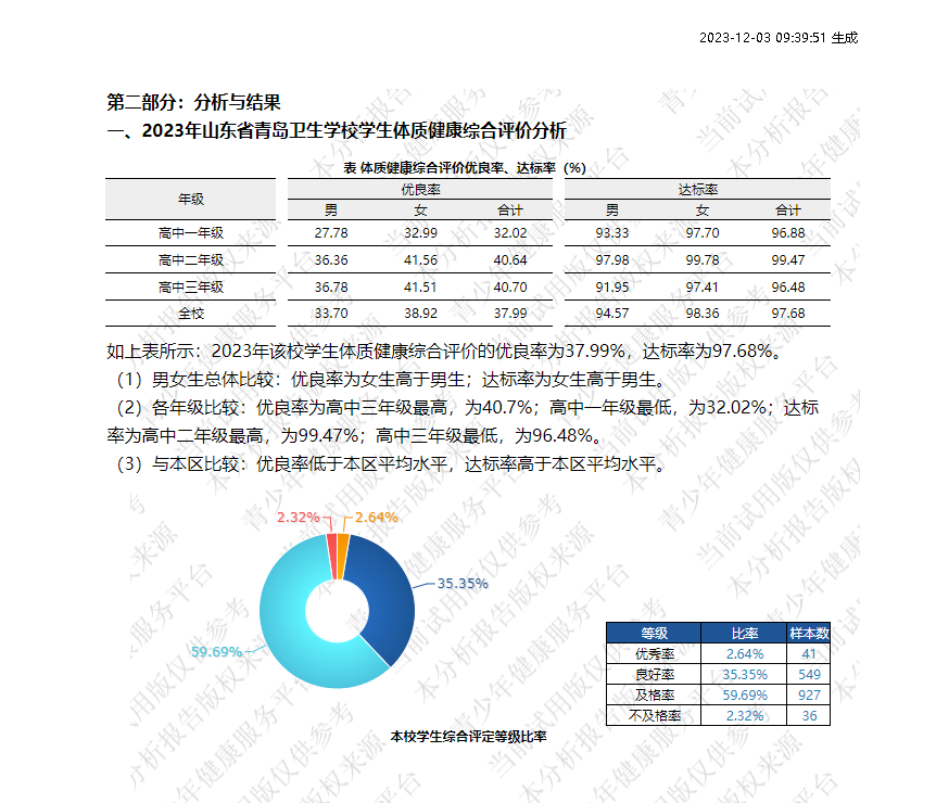 2023年該校學(xué)生體質(zhì)健康綜合評(píng)價(jià)的優(yōu)良率為37.99%,達(dá)標(biāo)率為97.58%。