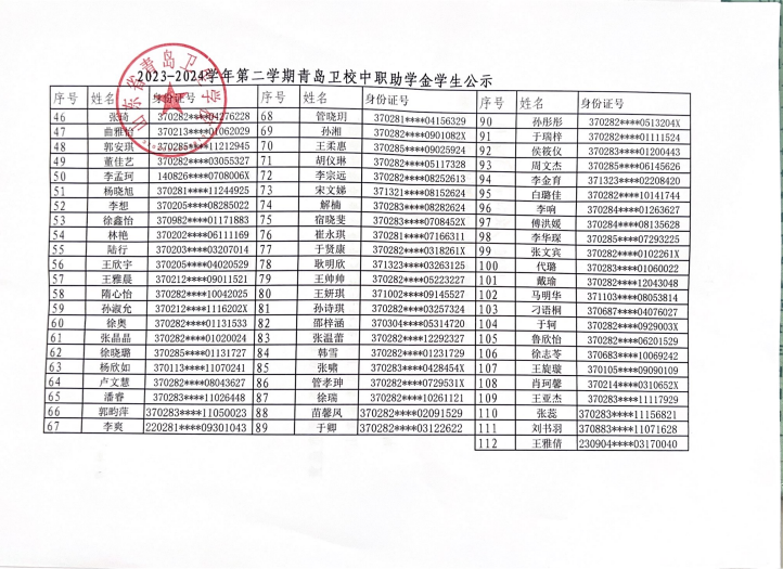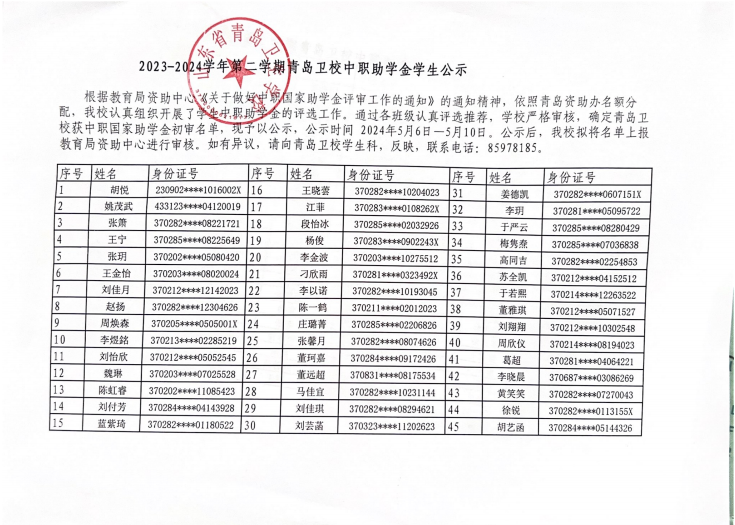 2023-2024學(xué)年青島衛(wèi)校第二學(xué)期助學(xué)金公示