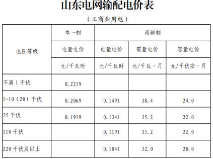 山東電網(wǎng)輸配電價(jià)表(工商業(yè)用電)