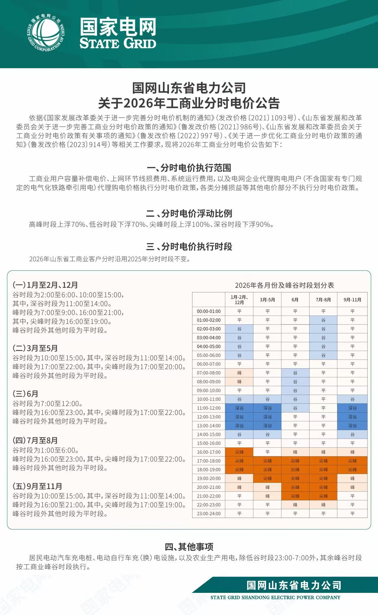 國網(wǎng)山東省電力公司關(guān)于2026年工商業(yè)分時電價公告