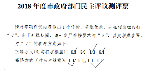測評票上每個部門有2項評議內(nèi)容,每項評議內(nèi)容都是單選,請在相應評議內(nèi)容對應欄內(nèi)打“√”,多選無效。