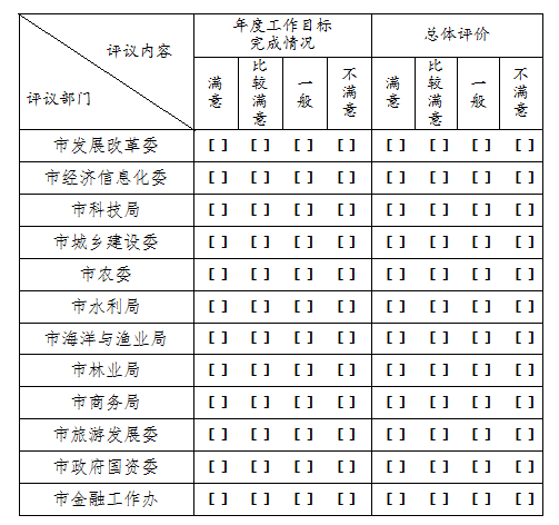 為調(diào)查了解市民代表對市政府部門履行職責的滿意度,請您結合市政府部門現(xiàn)場述職及平時了解掌握的情況,認真填寫《2018年度市政府部門民主評議測評票》。測評結果納入2018年市政府部門綜合考核成績。