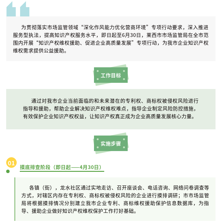 (一)開(kāi)展政府開(kāi)放活動(dòng)創(chuàng)新宣傳模式。創(chuàng)新宣傳載體,結(jié)合政府開(kāi)放月活動(dòng),系統(tǒng)開(kāi)展了一系列有特色、有亮點(diǎn)的宣傳活動(dòng),切實(shí)提升企業(yè)知識(shí)產(chǎn)權(quán)創(chuàng)造、運(yùn)用和保護(hù)宣傳成效。一是在“萊西市場(chǎng)監(jiān)管”微信公眾號(hào)“萊西市場(chǎng)監(jiān)管”萊西融媒月湖號(hào)等政務(wù)新媒體設(shè)立“優(yōu)化營(yíng)商環(huán)境 市場(chǎng)監(jiān)管在行動(dòng)”專題專欄,結(jié)合政務(wù)網(wǎng)做好知識(shí)產(chǎn)權(quán)保護(hù)、運(yùn)用、服務(wù)等環(huán)節(jié)的政策解讀,向企業(yè)發(fā)布知識(shí)產(chǎn)權(quán)保護(hù)典型案例,宣傳優(yōu)勢(shì)和示范企業(yè)申報(bào)須知、知識(shí)產(chǎn)權(quán)風(fēng)險(xiǎn)防控措施等內(nèi)容,多維度宣傳惠企政策,讓企業(yè)“聽(tīng)得懂”“信得過(guò)”,讓知識(shí)產(chǎn)權(quán)惠企政策直通企業(yè),讓企業(yè)辦事少跑路、讓政策“多跑腿”,取得良好成效。二是制定“2023年知識(shí)產(chǎn)權(quán)宣傳周活動(dòng)方案”,于4月26日上午9時(shí),在月湖廣場(chǎng)組織開(kāi)展“加強(qiáng)知識(shí)產(chǎn)權(quán)法治保障,有力支持全面創(chuàng)新”專項(xiàng)宣傳活動(dòng),通過(guò)制作宣傳橫幅、發(fā)放宣傳資料、現(xiàn)場(chǎng)科普咨詢等形式宣傳知識(shí)產(chǎn)權(quán)知識(shí),確實(shí)推動(dòng)企業(yè)知識(shí)產(chǎn)權(quán)發(fā)展、保護(hù),助力我市企業(yè)高質(zhì)量發(fā)展。
