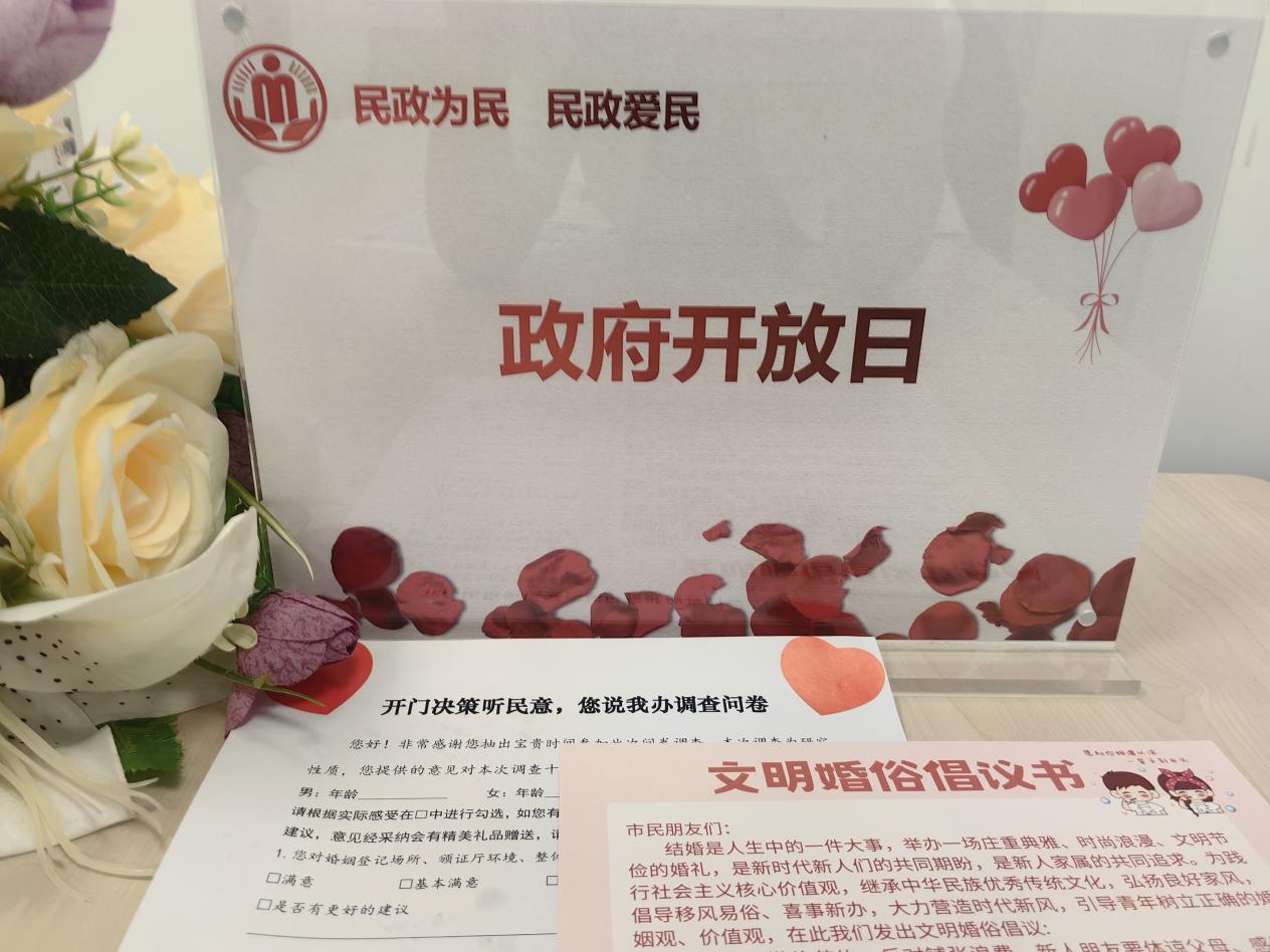 三是進(jìn)行《民法典》、婚姻登記政策解讀,填寫“開門決策聽民意,您說我辦”調(diào)查問卷,大家對婚姻登記服務(wù)環(huán)境、登記流程、服務(wù)能力、婚俗改革等方面提出了優(yōu)化建議和意見。
