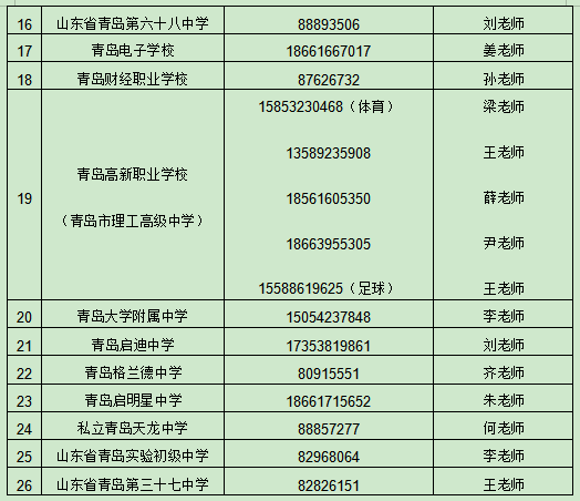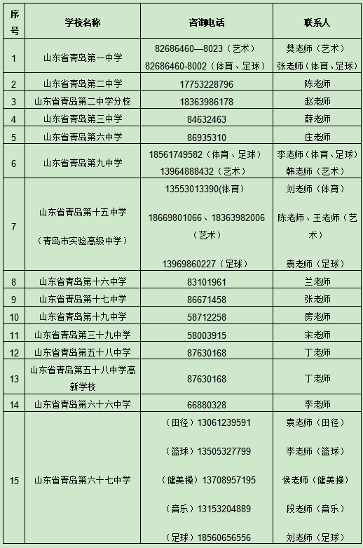2024年青島市教育局直屬學(xué)校體育藝術(shù)特長生招生咨詢聯(lián)系方式如下:
