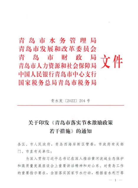 青島市水務(wù)管理局等六部門聯(lián)合印發(fā)《青島市落實(shí)節(jié)水激勵(lì)政策若干措施》