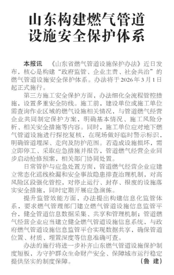 《山東省燃?xì)夤艿涝O(shè)施保護(hù)辦法》近日發(fā)布,核心是構(gòu)建“政府監(jiān)管、企業(yè)主責(zé)、社會(huì)共治”的燃?xì)夤艿涝O(shè)施安全保護(hù)體系。辦法將于2026年3月1日起正式施行。