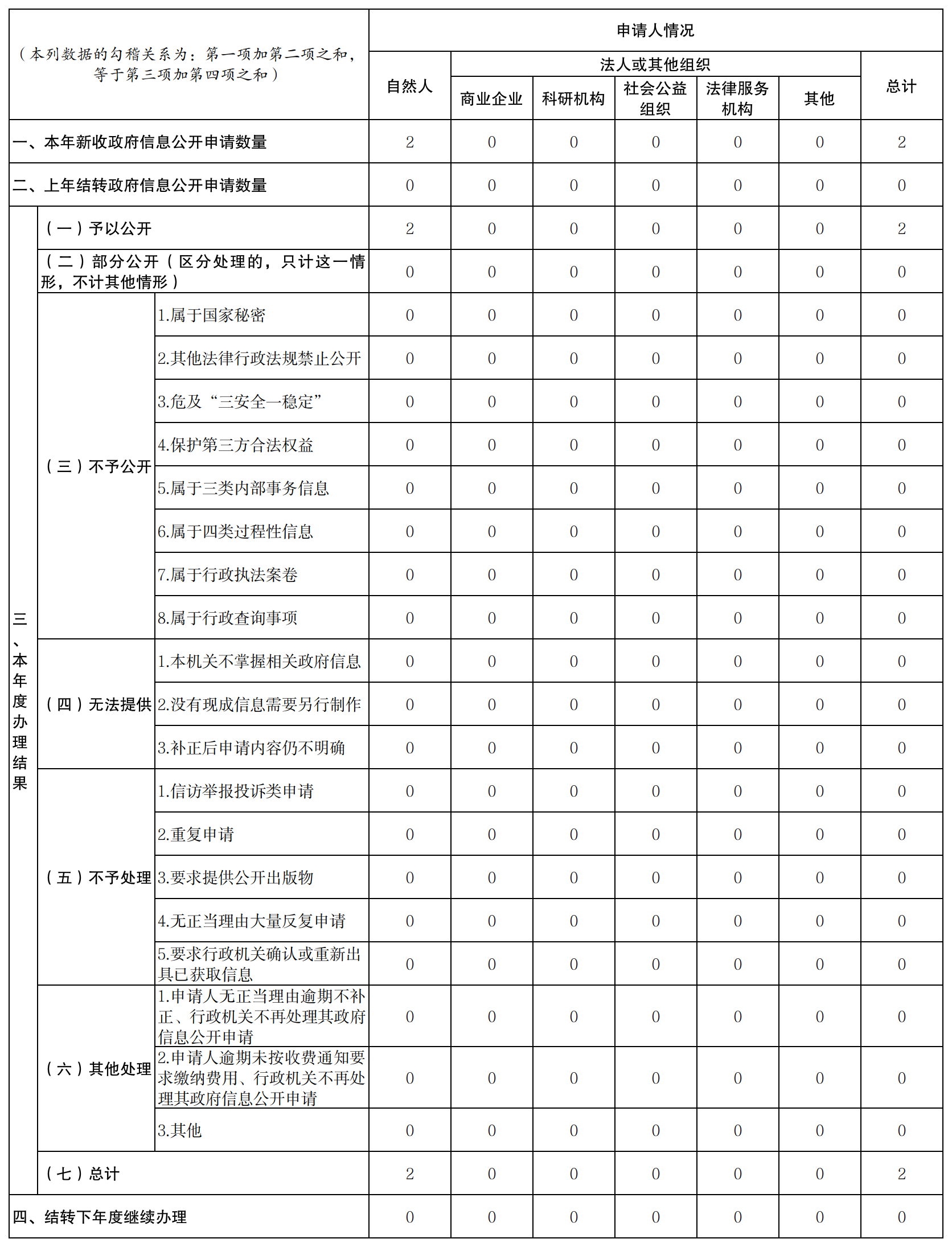 (二)依法依規(guī)辦理依申請(qǐng)公開。全面應(yīng)用依申請(qǐng)公開辦理系統(tǒng),持續(xù)健全辦理流程、明確答復(fù)標(biāo)準(zhǔn)、規(guī)范答復(fù)格式,告知書均由局主要領(lǐng)導(dǎo)簽發(fā),保障公眾依法獲取政府信息。2023年,共收到依申請(qǐng)公開事項(xiàng)2件,全部按時(shí)辦結(jié)并及時(shí)公開,無因政府信息公開申請(qǐng)?zhí)崞鹦姓?fù)議、行政訴訟情況。