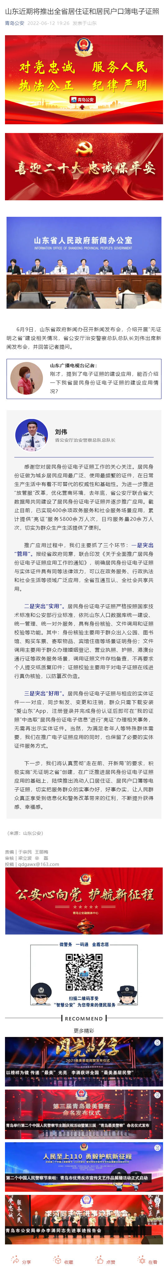山東近期將推出全省居住證和居民戶口簿電子證照