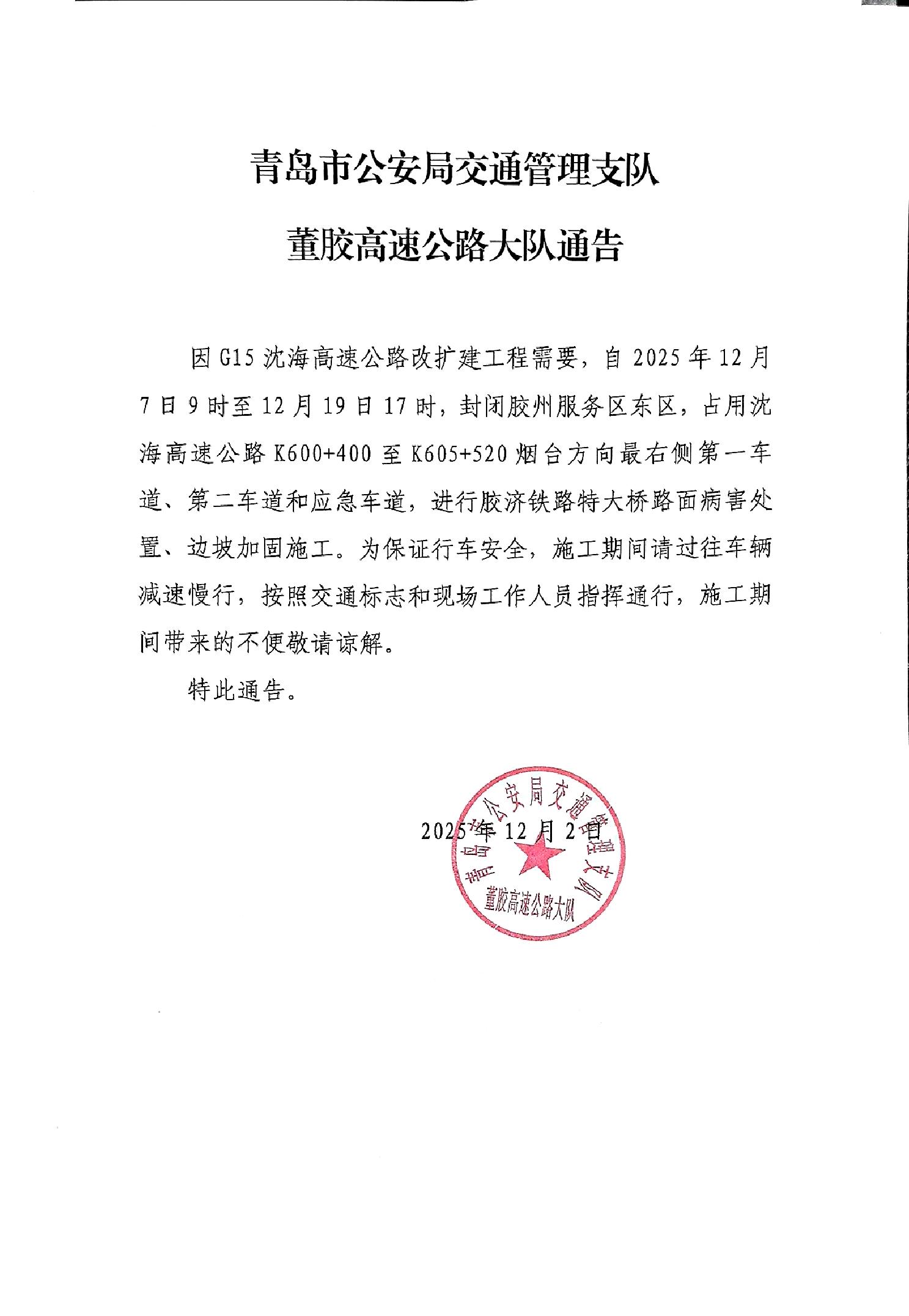 【施工公告】沈海高速公路K600至K605煙臺方向施工通告