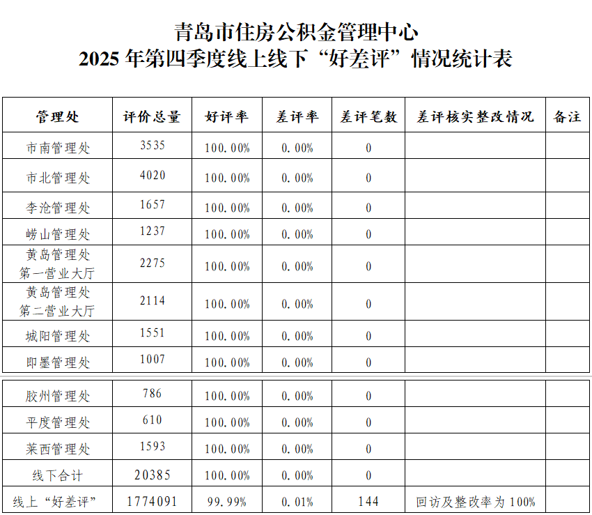 根據(jù)《青島市住房公積金管理中心公積金服務(wù)“好差評”制度實施方案》(青住金字〔2020〕48號)文件要求,現(xiàn)對2025年第四季度線上線下公積金服務(wù)事項“好差評”情況通報如下。