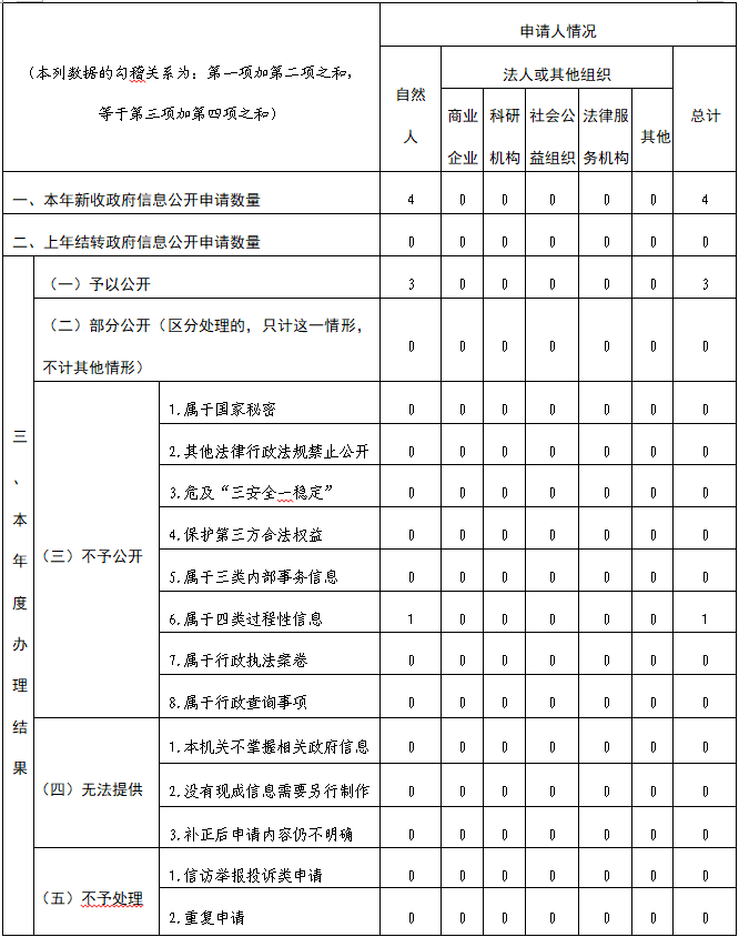 落實全省“依申請公開質(zhì)效提升年”活動要求,強(qiáng)化細(xì)化各環(huán)節(jié)工作要求,依法依規(guī)及時準(zhǔn)確予以答復(fù)反饋。本年度收到政府信息公開申請4件,均為自然人申請,從申請內(nèi)容上看,主要涉及行政執(zhí)法過程信息、住房補(bǔ)貼提取相關(guān)辦法、單位機(jī)構(gòu)設(shè)置情況、單位領(lǐng)導(dǎo)分工情況等,已按規(guī)定時限答復(fù)申請人,其中予以公開3件、不予公開1件。本年度未收到因信息公開引起的行政復(fù)議和行政訴訟。