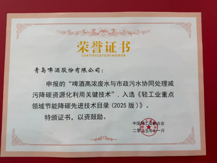 青島啤酒聯(lián)合水務(wù)集團(tuán)、青島理工大學(xué)研發(fā)的“啤酒高濃廢水與市政污水協(xié)同處理減污降碳資源化利用關(guān)鍵技術(shù)”目前已經(jīng)在青島啤酒38家工廠推廣使用,因節(jié)能減碳效果顯著,對(duì)上下游協(xié)同減污減碳作用較大,對(duì)啤酒行業(yè)引領(lǐng)示范作用突出,成功入選《輕工業(yè)重點(diǎn)領(lǐng)域節(jié)能降碳先進(jìn)技術(shù)目錄(2025版)》,全國(guó)僅18項(xiàng),啤酒行業(yè)唯一。