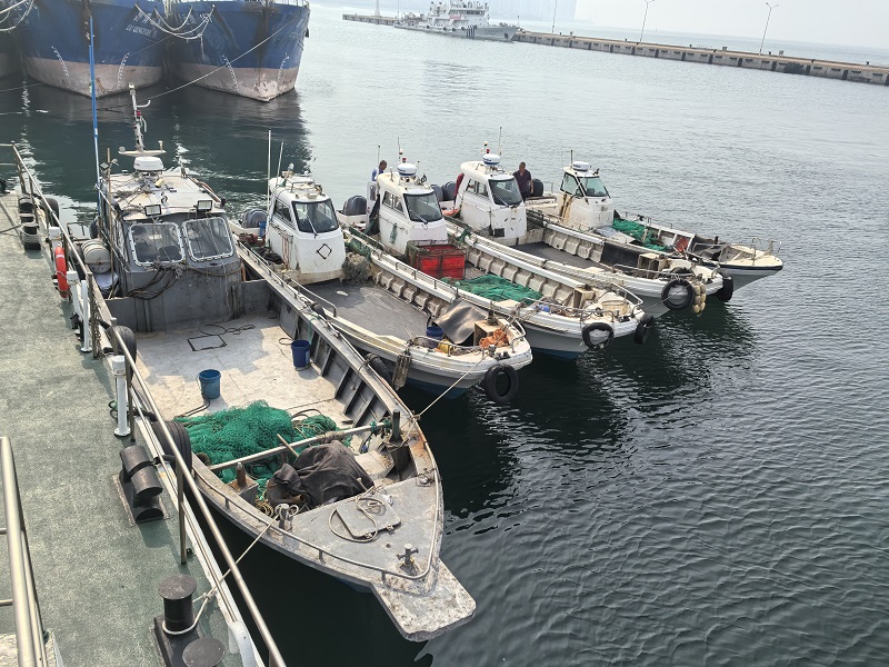 “中國(guó)漁政37016”“中國(guó)漁政37601”兩艘執(zhí)法船按照預(yù)定方案,分別部署在關(guān)鍵海域,充分利用船載雷達(dá)系統(tǒng)進(jìn)行全天候、不間斷的掃海監(jiān)測(cè),同時(shí)對(duì)海面進(jìn)行拉網(wǎng)式清網(wǎng)巡查,重點(diǎn)排查可疑船只和違規(guī)網(wǎng)具。行動(dòng)期間,采取“海陸聯(lián)動(dòng)、晝夜結(jié)合”的戰(zhàn)術(shù),海上執(zhí)法船與陸上指揮中心及岸巡隊(duì)伍保持實(shí)時(shí)信息互通與高效協(xié)同,通過(guò)共享情報(bào)、綜合研判,不斷縮小可疑目標(biāo)范圍。經(jīng)過(guò)連續(xù)19小時(shí)的高強(qiáng)度巡查、蹲點(diǎn)守候和縝密分析研判,執(zhí)法人員最終鎖定了目標(biāo)區(qū)域。6月25日凌晨,兩艘漁政船果斷派出執(zhí)法艇,自海上向董家口東側(cè)預(yù)定水域?qū)嵤┚珳?zhǔn)夾擊合圍。與此同時(shí),陸上巡查力量也迅速向該區(qū)域集結(jié),形成海陸合圍之勢(shì)。凌晨4時(shí)許,執(zhí)法人員在董家口東港池內(nèi)現(xiàn)場(chǎng)查獲停靠于此的5艘快艇。經(jīng)執(zhí)法人員登臨初步檢查,發(fā)現(xiàn)這些快艇上均存有漁網(wǎng)等捕撈網(wǎng)具,且船體有明顯捕撈作業(yè)痕跡。