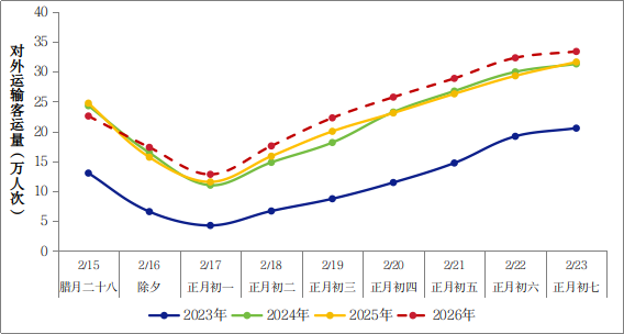 ? ? ? ? “春節(jié)”假期期間,全市對(duì)外運(yùn)輸客運(yùn)量整體呈現(xiàn)“前低后高”的運(yùn)行態(tài)勢(shì)。除夕至正月初一期間,公眾多以居家團(tuán)圓為主,對(duì)外運(yùn)輸客運(yùn)量保持低位運(yùn)行;自正月初二起,探親訪友、旅游度假等出行需求逐步釋放,對(duì)外運(yùn)輸客運(yùn)量逐日穩(wěn)步攀升;隨著假期臨近尾聲,返程客流持續(xù)匯聚,客運(yùn)量不斷走高,于正月初七達(dá)到整個(gè)“春節(jié)”假期的客流峰值。