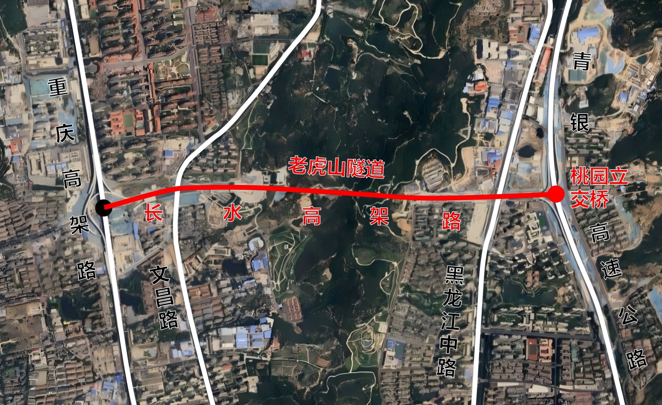老虎山隧道(Lǎohǔshān Suìdào):東起黑龍江中路西,西止文昌路東,為分離式雙洞隧道,長(zhǎng)1551米,穿越老虎山。該隧道為長(zhǎng)水高架路之穿越山體的通車隧道,為增強(qiáng)交通設(shè)施名稱的指位指向性,使用該隧道穿越山體名稱的方式命名,擬命名為老虎山隧道。