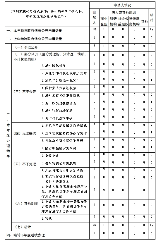 (二)政府信息依申請公開。共受理政府信息公開申請19件,已全部在規(guī)定期限內(nèi)向申請人答復(fù)告知。從申請人屬性來看,18件為自然人提出申請,1件申請為企業(yè)法人提出。從辦理結(jié)果看,根據(jù)《條例》規(guī)定,對本單位受理的申請,同意公開的4件,占21.1%;部分公開的2件,占10.5%;不予公開的4件,占21.1%;無法提供的8件,占42.1%,其中,本機(jī)關(guān)不掌握相關(guān)政府信息的7件,占87.5%,沒有現(xiàn)成信息需要另行制作的1件,占12.5%;因?qū)偻对V類申請不予處理的1件,占5.2%。本年度本單位全年沒有因政府信息公開原因提起行政復(fù)議、行政訴訟情況。