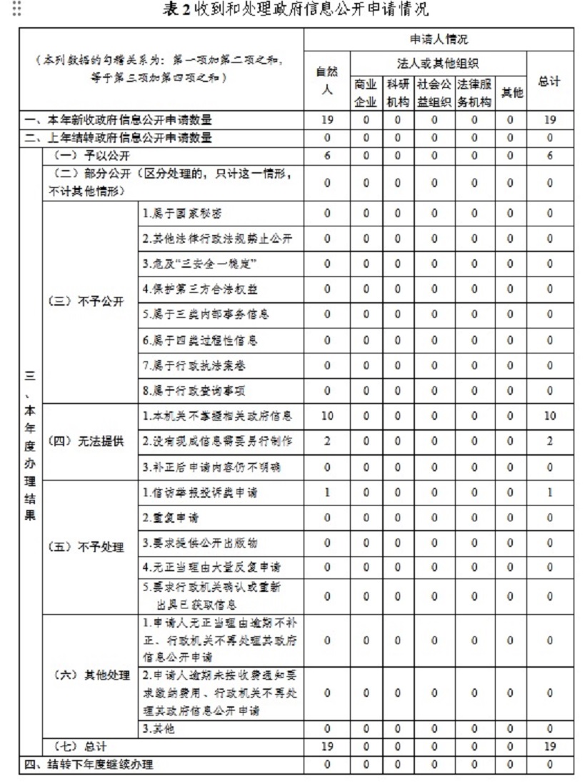 收到和處理政府信息公開申請(qǐng)19件,均為自然人申請(qǐng),按期答復(fù)19件,其中予以公開6件,不予公開0件,無(wú)法提供12件,不予處理1件。