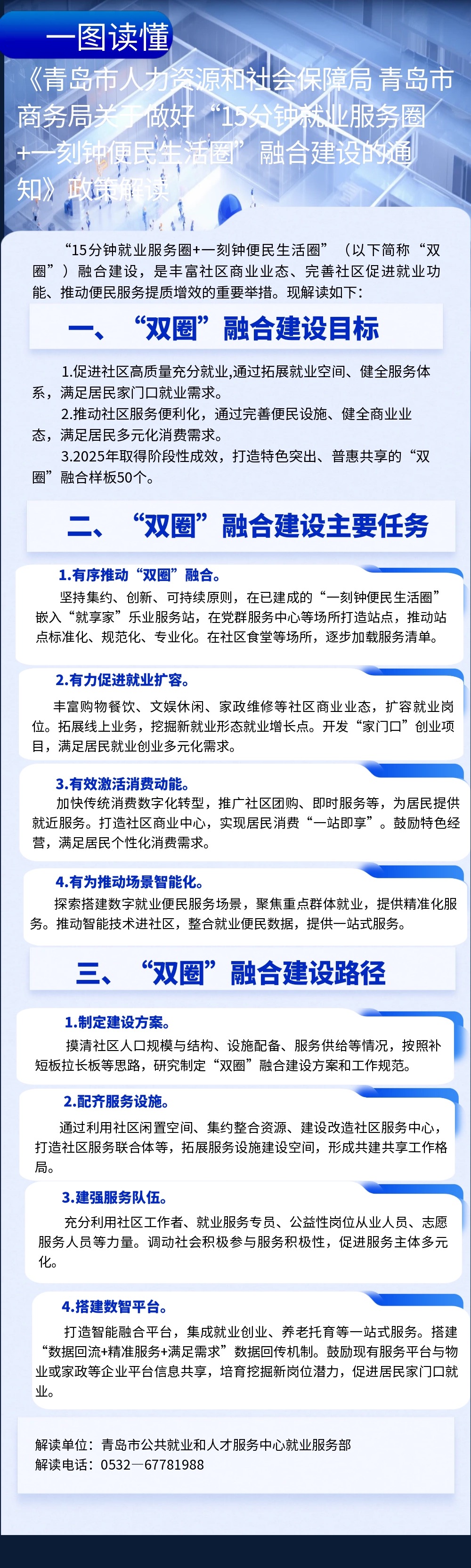 【圖片解讀】《青島市人力資源和社會保障局 青島市商務局關于做好“15分鐘就業(yè)服務圈+一刻鐘便民生活圈”融合建設的通知》政策解讀