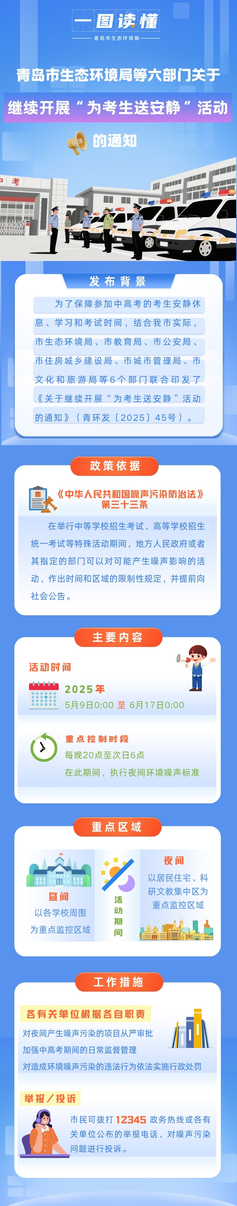 【圖片解讀】青島市生態(tài)環(huán)境局等六部門關(guān)于繼續(xù)開展“為考生送安靜”活動(dòng)的通知