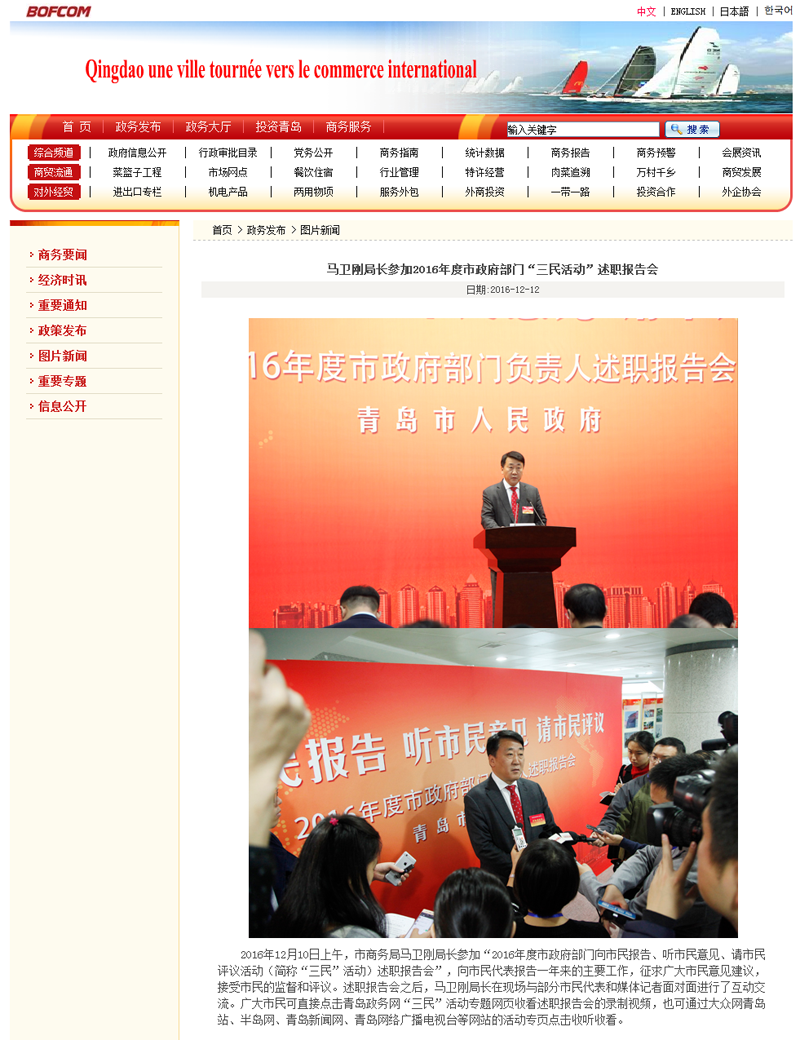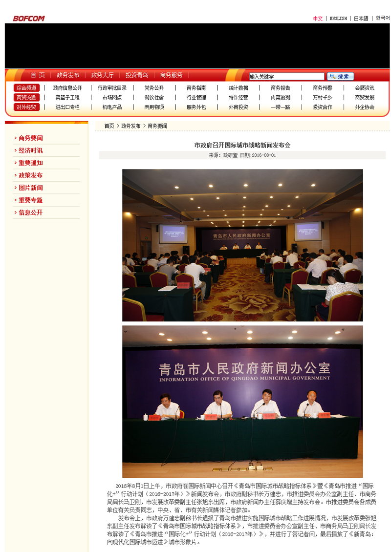 2.充分發(fā)揮報紙、廣播、電視、網(wǎng)絡(luò)等媒體作用,主動發(fā)布信息,使主流聲音和權(quán)威準(zhǔn)確的政務(wù)信息在網(wǎng)絡(luò)領(lǐng)域和公共信息傳播體系中廣泛傳播。重點(diǎn)圍繞國際貿(mào)易中心城市建設(shè),青島國際城市戰(zhàn)略、外貿(mào)進(jìn)出口、利用外資與世界500強(qiáng)企業(yè)合作、“引進(jìn)來”和“走出去”相結(jié)合、跨境電商等一系列活動,2016年全年各類媒體刊登商務(wù)工作信息1000余篇。